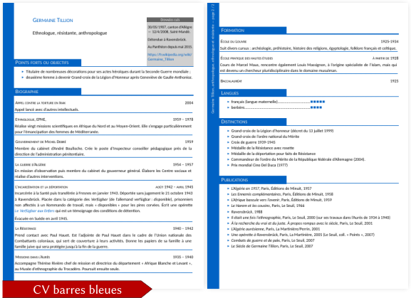 Modèle illustré par le CV de Germaine Tillion, ethnologue, résistante et anthropologue.