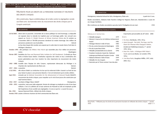 Le modèle de CV chocolat est illustré par celui de Rosa Parks, militante des droits civiques.