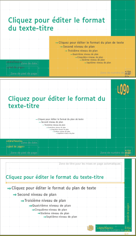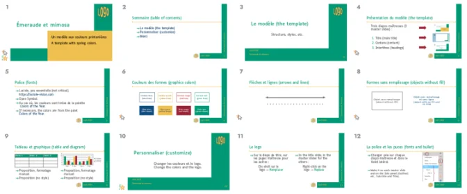 Si vous voulez personnaliser tout ça, il faut aller sur les pages maîtresses et jouer dans le Volet latéral. De toute façon c’est expliqué dans le modèle, en anglais et en français. C’est pour cela qu’il a quatorze diapos. Si vous l’adoptez, vous pourrez les supprimer.